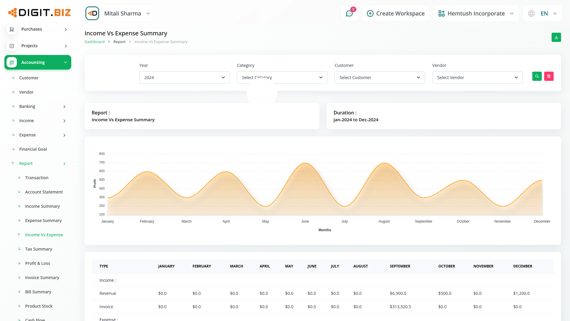 A budget is a financial plan for a specified period to keep in check with the working capital. This feature here helps to maintain the capital flow. You can set monthly, quarterly, half-yearly, or yearly budgets according to your business plans and needs. The main categories are “Income” and “Expense” where one can edit /update /delete the sub-categories as well.