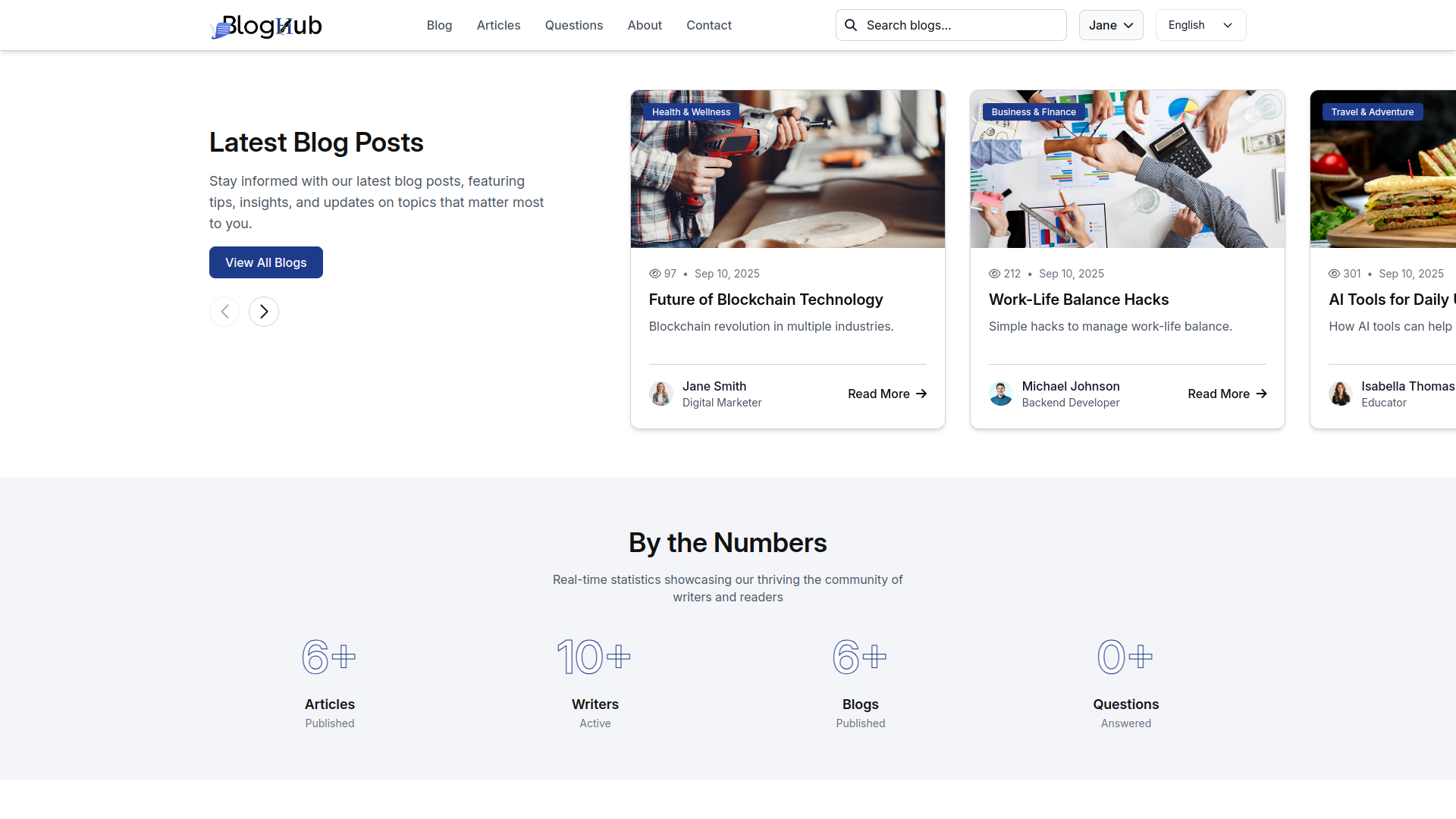 Users can read and search through all published blogs easily. Filter blogs by topics, categories, and dates to find specific content. Each blog page shows the content, author details, and related blogs. Visitors can like and save blog posts on social media. The system tracks views and shows popular content to other users.